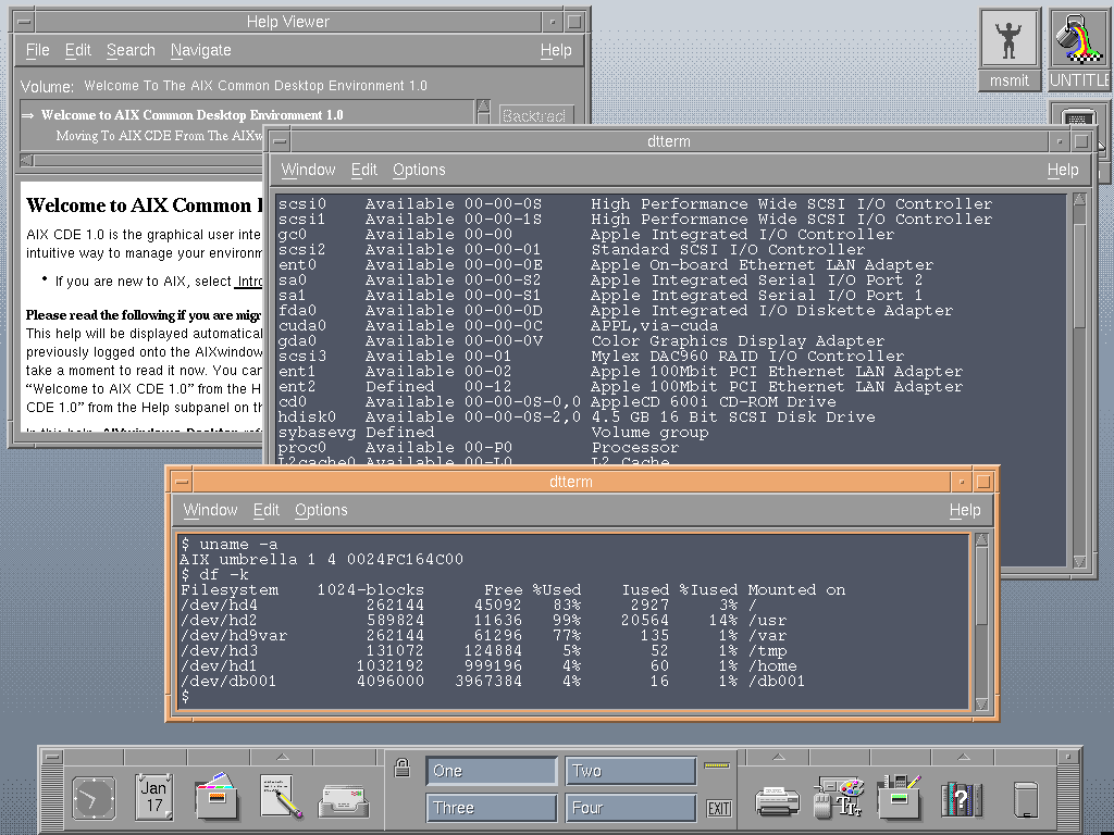 | 1996 • 1024 × 768 PNG (26 KB) | AIX Common Desktop Environment (CDE) 1.0 Screen capture: Apple Network Server 700/200. DEC, IBM, HP, and Sun were all offering CDE around this time. They all looked pretty much exactly alike—thus, "common". This one is a bit funny because it's from an Apple system running IBM's AIX 4.1.5... from around the same time they were putting the Finder in clown shoes and trying to make Copland work. |