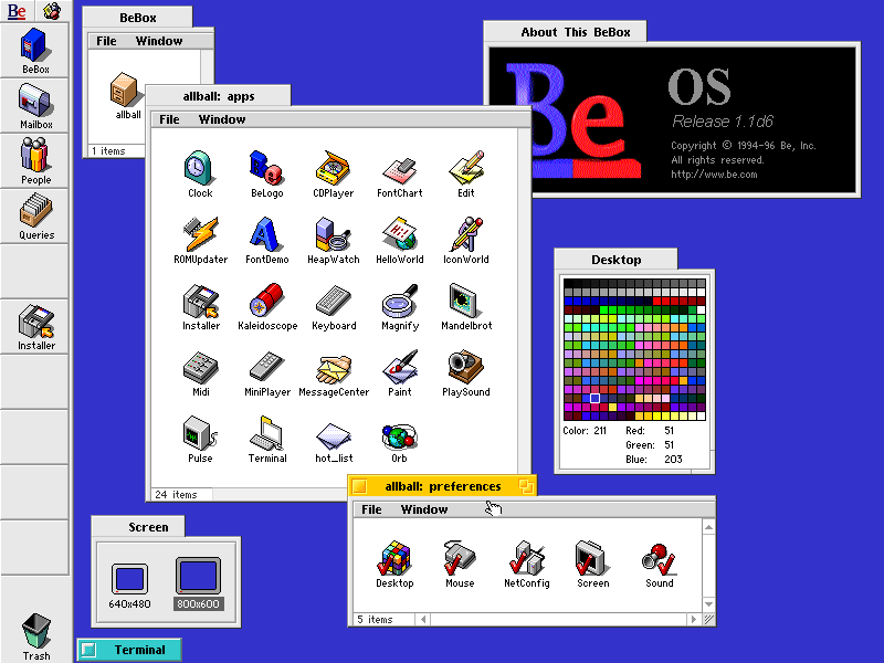 Screen capture: Rev 5 BeBox showing DR7 of the BeOS, with Screen preferences open and sample applications running. |