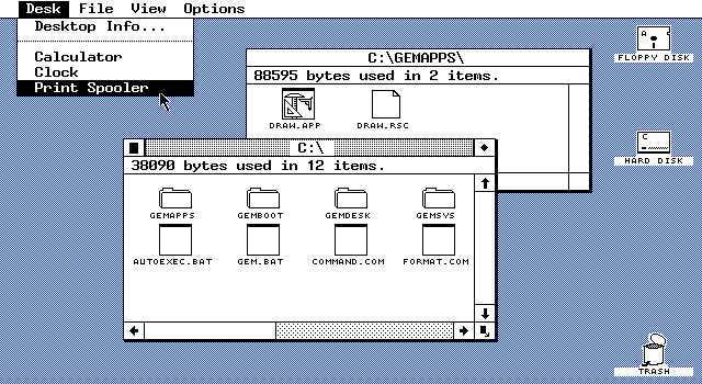 Screen capture: GEM Desktop 1.2 in 16-color EGA mode. This version of GEM for the IBM PC was the last to be released before Apple prevailed against DRI in its seminal "look and feel" lawsuit. |