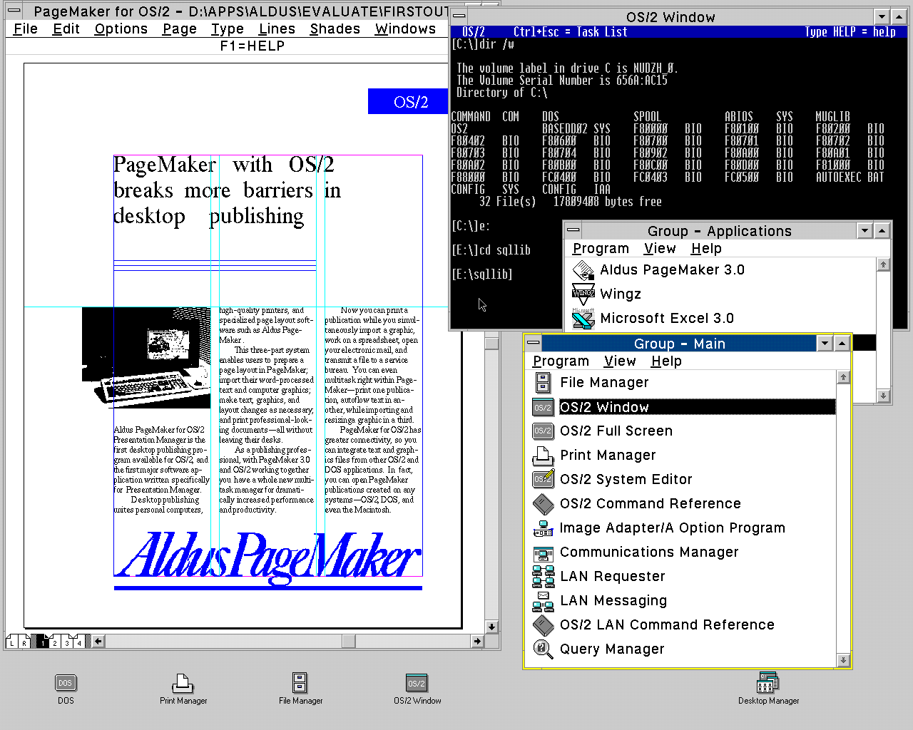 | 1989 • 1024 × 768 GIF (48 KB) | Windows/386 Presentation Manager Screen capture: Compaq Deskpro 386 & Western Digital Paradise 8514/A+ — Windows/386 2.11, showing Aldus Pagemaker 3.0 and Corel Draw 1.10 in 256 colors under Presentation Manager. When the display offers more than 16 colors, Windows 2.1 implements its color palette as if it were a direct-color visual. With 256 colors, there is a wrinkle: eight bits of color depth can't be evenly divided between three primary colors and so blue draws the short straw (RRRGGGBB). This causes certain screen elements which should appear in neutral gray to have a brown or violet tint. The effect is quite apparent when comparing against the 64-color (RRGGBB) Rendition-I screenshot above or the 256-color Windows 3.0 and OS/2 2.1 screenshots below (color gradient fills preview as grayscale in Corel Draw 1.x). |