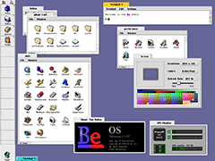 Screen capture: Rev 5 BeBox showing DR5 of the BeOS, with Browser windows open and minimized application ("Magnify"). The 1.1d5 release made it into the hands of only the very earliest developers; it was replaced by 1.1d6 less than a month later. The BeBox icon and window close box still have the same appearance as in the Hobbit system. |