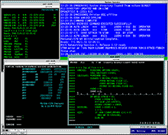 Screen capture: Power Macintosh G4 DP — Multiple system environments in use - Mac OS X, Unix, AIX, CDE, remote 3270. VM/ESA R/390 restorations in progress. |